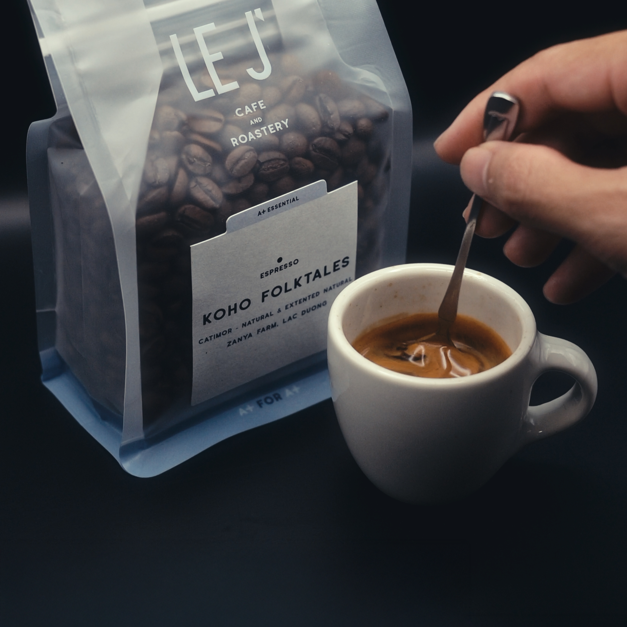 Là một trong những blend nổi tiếng nhất của Le J’, thế nên KOHO Folktales cần phải đảm bảo được độ ổn định đặc biệt khi rang pre-blending hai loại cà-phê rất nhạy cảm với nhiệt, đặc biệt là cà-phê sơ chế extended natural (sơ chế khô lên men dài). Với hồ sơ rang ổn định, độ chênh nhiệt từ lúc bắt đầu nổ đến khi kết thúc thấp thì KOHO Folktales mang đến hương vị tròn trịa đầy đặn với độ ngọt rất cao, vị chua vừa phải, vị trái cây họ quả hạch rõ ràng cùng hương hoa đỏ vương vấn.